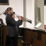 Direkt nach dem Chorbeitrag ,,Wie durch einen der Tod“, den der Chor an diesem Abend ihrer tags zuvor verstorbenen langjährigen Chorschwester Christine Mackenbruck widmete, begeisterte Gerrit Miehkle zusammen mit dem Trompeter Daniel Salinga bei dem Titel ,,Die Trompete erschallt“. Eine beeindruckende stimmliche und intrumentalische Darbietung dieses Stückes, die einem den Atem stocken ließ.